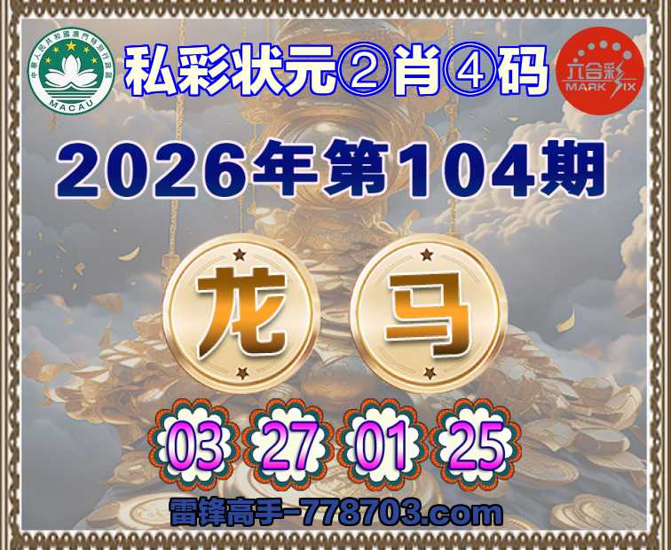 104期:《私彩状元》 💎②肖④码💎【龙】【03.27.01.25】开:马01