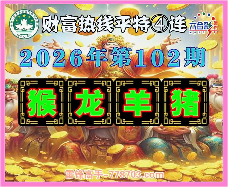 102期:【财富热线】 平特④连【猴龙羊猪】开:猴47,龙03,羊36,猪20